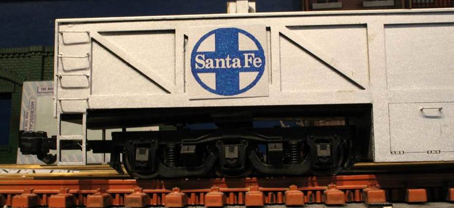 Die Drehgestelle stammen von Aristocraft. Ich konnte glücklicherweise noch zwei Paar davon erstehen. In der Schlussversion werden sie Silberfarben gespritzt und unter dem ebenfalls in "Altsilber" gespritzten Boomcar definitiv montiert werden.