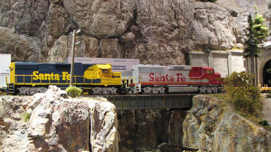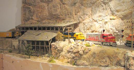 ![]() Bild: Zwei BNSF und eine NF (Norfolk and Western in der Schlucht). ![]() Bild: Das Snowshed bildet eine gute Kulisse für viel Action. |